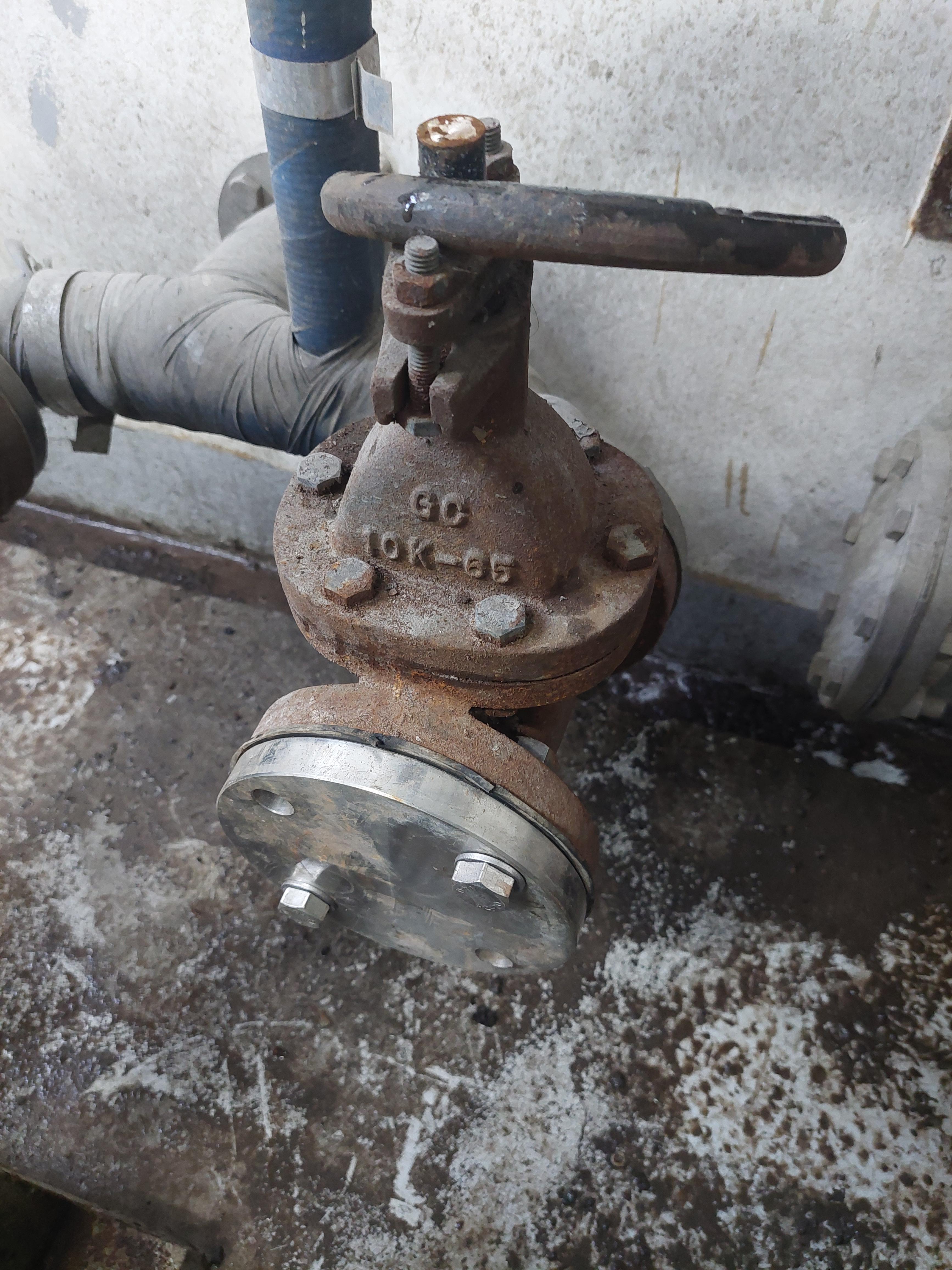 위 사진은 현장에서 게이트밸브 손잡이가 노후화로 파손이 되어 더 이상 조작이 불가능해져 계속 누수가 발생하는 상황이 되어버렸습니다. 그래서 급하게 플랜지를 이용하여 끝단 부분을 막아 더 이상 누수가 되지 않게끔 조치를 취한것입니다.