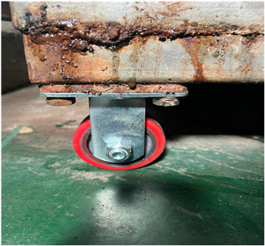 그래서 저도 바퀴를 먼저 분해한뒤에 샘플을 가지고 취급점에 가져가서 똑같은 제품을 구입할 수가 있었습니다. 바퀴를 분해할 때 약간의 노하우라면, 무게가 가벼운 박스라면 뒤집어서 쉽게 볼트를 풀어 탈거하면 되지만 정말 무거운 대차들은 그렇게 할 수가 없습니다. 그럴 때 현장에 호이스트가 있다면 바퀴쪽 꼭짓점을 살짝 들어준 다음에 바퀴를 풀어내면 됩니다.