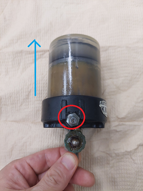 구리스 보충 주입구 밑으로 노란색 원으로 표시해둔 돌릴수 있는 밸브가 보입니다.이 밸브의 조절에 따라 손으로 잡고 있는 부분의 토출방향으로 구리스가 자동으로 밀려나오게 되는 것입니다. 보충시에 이 부분이 열려있다면 구리스가 밀려 나올수도 있기 때문에 꼭 잠근 다음에 보충을 해줘야 합니다. 보충이 끝난 다음에는 구리스 컵을 현장에 설치하여 이 밸브를 열게되면 조절 간격에 따라 일정한 양이 스프링의 힘으로 밀려나오게 되는 것입니다.