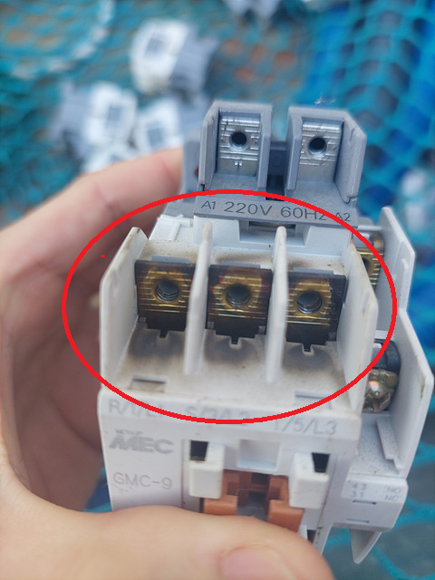 지금은 단종된 LS산전의 GMC-9 모델입니다. 워낙 오래 사용하다 보니 빨간색 원으로 표시한 R, S, T 결선 부위가 시커멓게 그을려 있는 것을 보실 수가 있습니다.