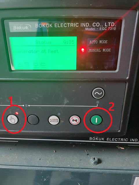 보통 비상발전기는 한전에서 들어오는 전기가 끊어졌을때 자동으로 가동이 되는 구조입니다. 그래서 평소에는 AUTO 모드로 유지가 되어있을 겁니다. 이 상태에서 수동운전을 하고 싶을 때는