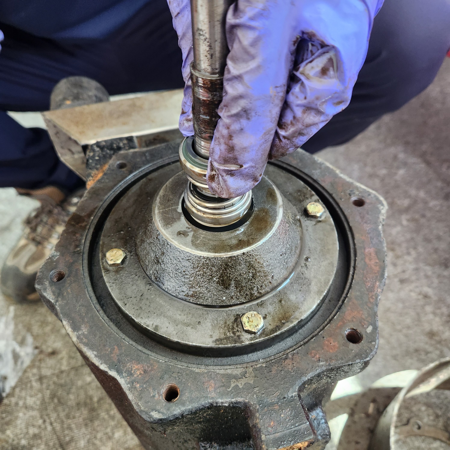 이제 샤프트 안착 작업은 앞뒤로 끝이 났습니다. 다시 앞쪽으로 돌아와서 메커니컬씰 고정자가 이미 박혀있는 상태이므로 나머지 부분을 잘 조립해줍니다. 순서대로 회전자, 스프링, 회전자 순으로 넣어줍니다.