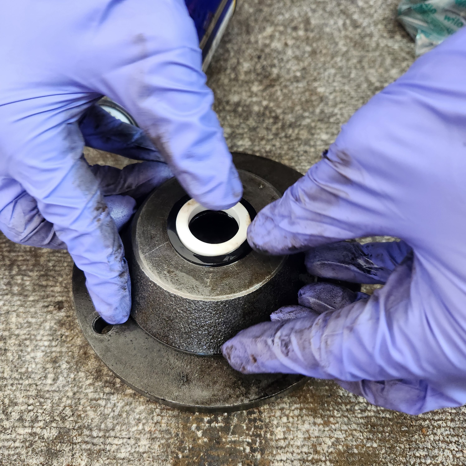 베어링 박음이 끝났으면 프런트 베어링 커버에 메커니컬씰 고정자부터 조립해줍니다. 샤프트와 프론트 베어링 커버를 조립한채로 메커니컬씰 고정자를 넣으려고 하면 번거롭기 때문에 꼭 먼저 고정자부터 조립을 하고 샤프트를 조립해줍니다.