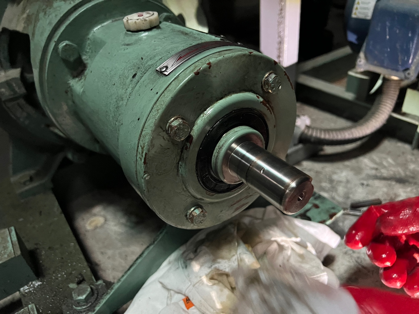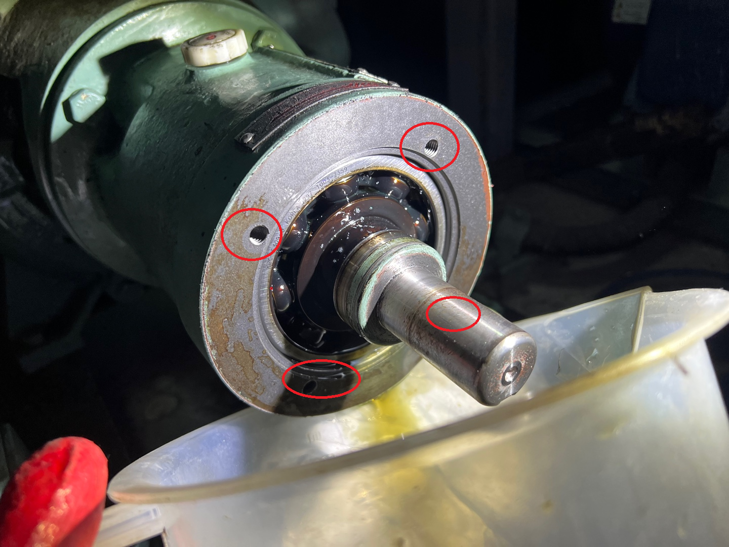 총 4군데의 볼트를 풀어 베어링 케이스를 벗겨내었고 안쪽에 샤프트를 고정하고 있는 베어링이 보입니다. 베어링 윤활을 위해 들어가 있던 오일을 어느 정도 빼낸다음 조립해야 할 부분은 깨끗이 닦아 줍니다.