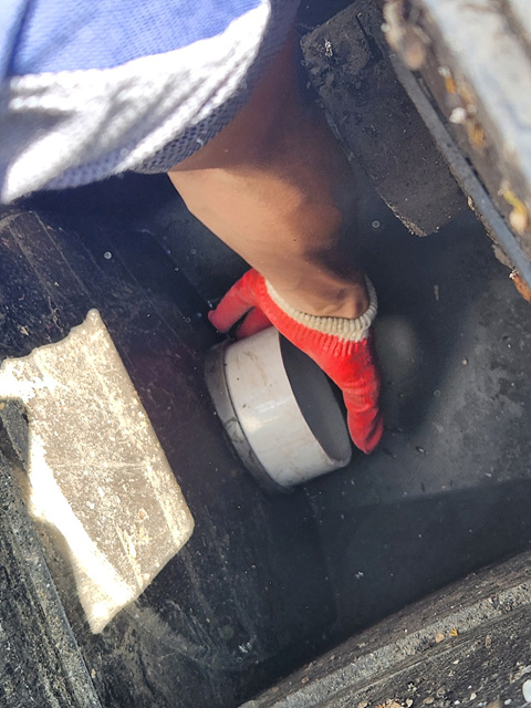 오수받이 쪽에 시공을 하기 위해서 들여다 보았더니 파이프가 소켓에 박혀 있었습니다. 그래서 소켓 부위에 역지변을 삽입할수 있도록 파이프 소량을 먼저 넣는 작업을 하였습니다. 이렇게 역지변을 가조립 해보았을때 공간이 많이 남았다면 손을 넣어서 소켓 설치 여부를 파악하셔야 합니다.