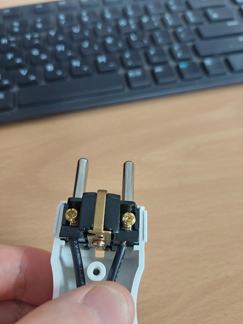 220v의 입력전압이 제대로 들어갈 수 있도록 양쪽으로 알맞게 전기선을 플러그 구멍사이에 넣어준 다음 볼트를 돌려 전기선이 플러그에서 빠지지 않도록 고정하여 줍니다.