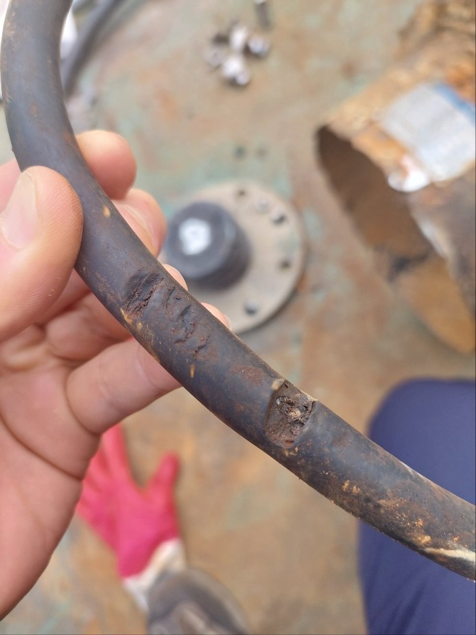전선이 찍힘으로 인해서 피복이 벗겨졌습니다. 사진상으로는 잘 안보이지만 벗겨져서 안쪽 구리전선이 보일 정도입니다. 현장에서 동력선은 잘 말아서 피해가 가지 않게 해야 하지만, 부득이하게 실수로 밟거나 , 당기거나 하중에 의해 짓눌러지면 손상이 가기 쉽습니다. 특히, 수중에서 회전을 하는 기계들은 이 동력선이 물속에 잠겨 보이지 않기 때문에 각별한 주의가 필요합니다. 전선이 쳐지거나 하게 되면 회전기계에 의해 손상이 갈 수도 있기 때문이지요.