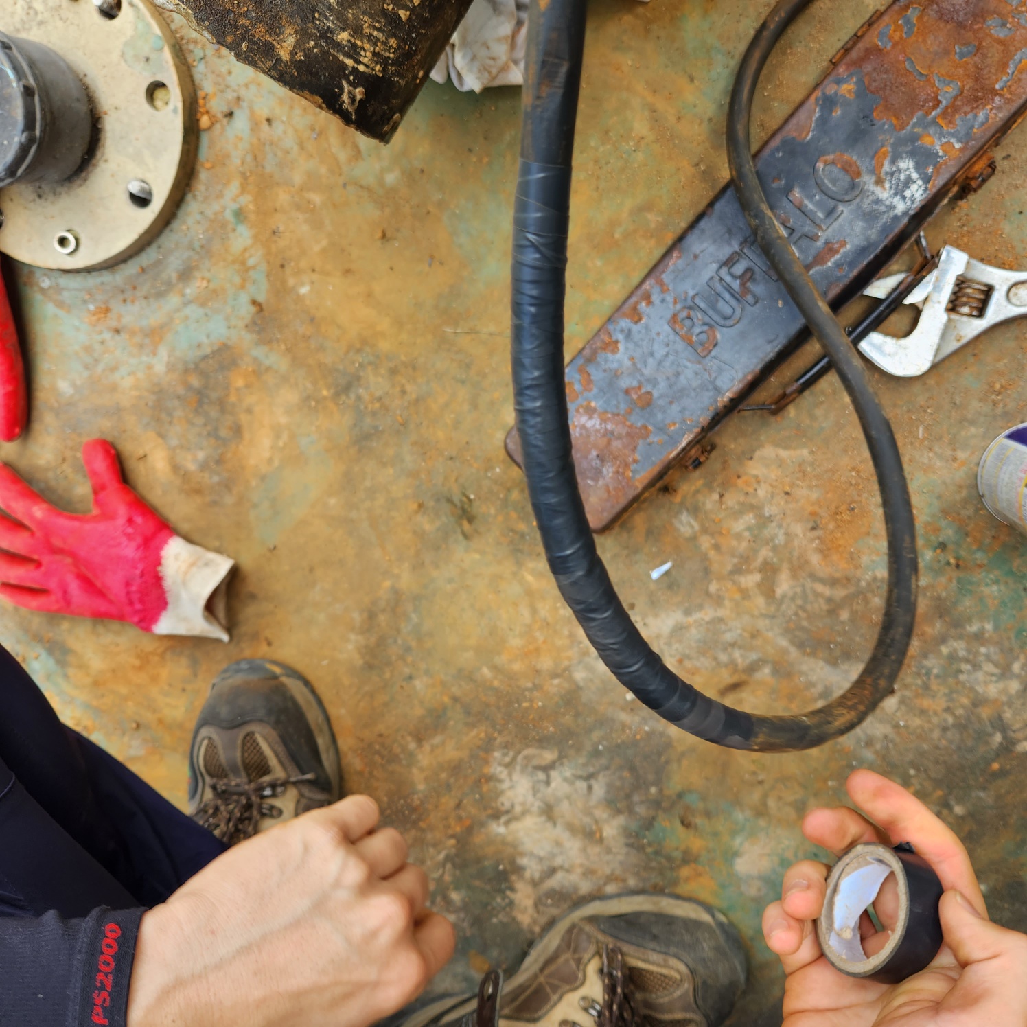 전선이 찍힘으로 인해서 피복이 벗겨졌습니다. 사진상으로는 잘 안보이지만 벗겨져서 안쪽 구리전선이 보일 정도입니다. 현장에서 동력선은 잘 말아서 피해가 가지 않게 해야 하지만, 부득이하게 실수로 밟거나 , 당기거나 하중에 의해 짓눌러지면 손상이 가기 쉽습니다. 특히, 수중에서 회전을 하는 기계들은 이 동력선이 물속에 잠겨 보이지 않기 때문에 각별한 주의가 필요합니다. 전선이 쳐지거나 하게 되면 회전기계에 의해 손상이 갈 수도 있기 때문이지요.