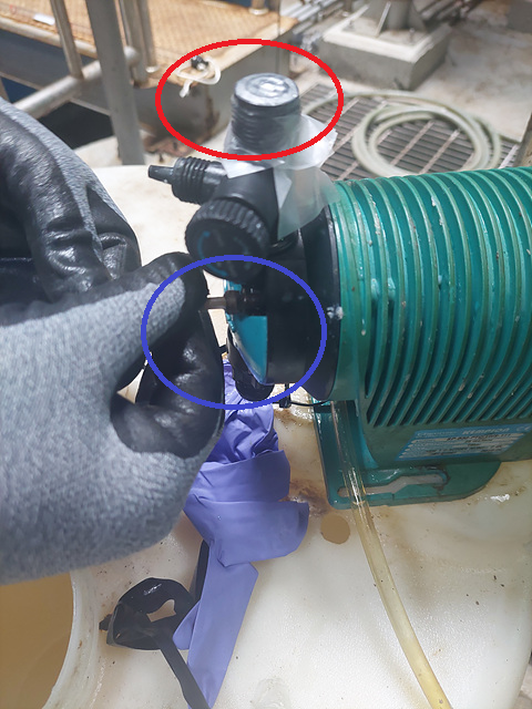 빨간색으로 표시해둔 부품을 잃어버려 정량 펌프를 사용하는 데 있어 어려움이 발생하였습니다. 소형 정량펌프는 가격이 그리 비싸지 않고, 관련 부품에 제법 잘 나오기 때문에 꼭 메이커에 문의하셔서 부품을 수급하여 교체를 하시는 것이 가장 좋습니다.