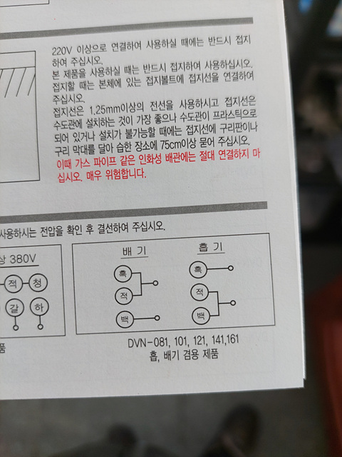흡배기가 가능한 모델을 구입하셨다면 결선에 따라서 방향이 결정됩니다. 우리가 가정에서 쓰는 220v는 2가닥의 전원선을 이용하게 됩니다.