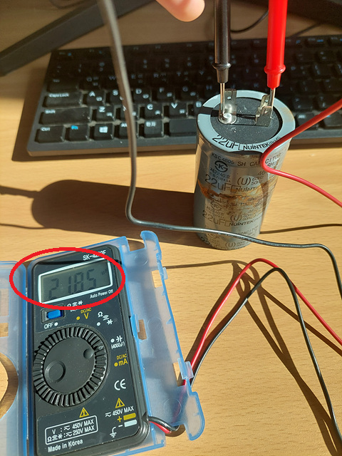 테스트기 디스플레이에 21.85라고 표시가 됩니다. 22uF 콘덴서 이므로 아직 용량이 괜찮다는 말이며 사용하는데 문제가 없는 제품입니다. 만약 테스터를  하였는데 용량이 터무니없이 나온다거나 수치에 문제가 있다고 판단이 된다면 콘덴서를 교체해 주시면 됩니다.
