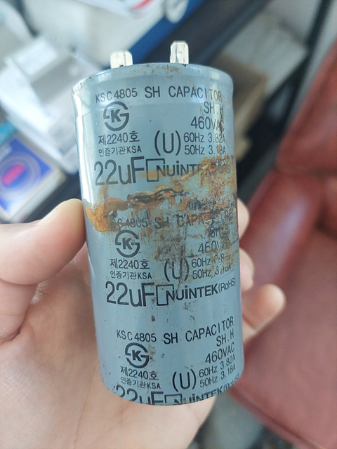 큼지막하게 22uF 라고 적힌 것이 보이고 460 VAC라는 것도 보입니다. 460 VAC는 허용 전압이고 우리가 체크해야 할 부분은 22uF입니다. 콘덴서에 적힌 22uF는 전기용량으로써 단위는 마이크로패럿으로 읽습니다. 너무 깊게 들어가면 힘들기 때문에 정비하는 입장에서는 간단하게 콘덴서 용량을 체크하는 방법을 익히는 게 좋습니다.