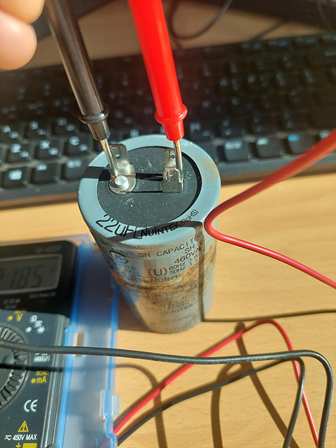 테스트기 디스플레이에 21.85라고 표시가 됩니다. 22uF 콘덴서 이므로 아직 용량이 괜찮다는 말이며 사용하는데 문제가 없는 제품입니다. 만약 테스터를 하였는데 용량이 터무니없이 나온다거나 수치에 문제가 있다고 판단이 된다면 콘덴서를 교체해 주시면 됩니다.