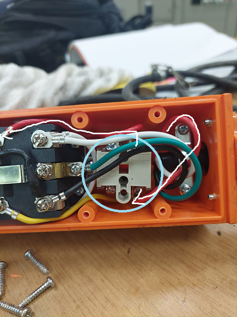 현재 현장에서는 모든 리모컨의 버튼 조작이 불통이므로 리모컨의 비상정비 버튼을 한번 살펴보았습니다. 비상정비 버튼 뒤쪽에는 B접점(NC)으로 구성이 되어있고 항상 전기가 통하게끔 되어 있습니다. 흰색으로 표시한 것이 비상정지 버튼으로 연결되는 선이고요. 이 선이 비상정비 버튼을 거쳐서 조작버튼으로 들어가는 구조입니다.