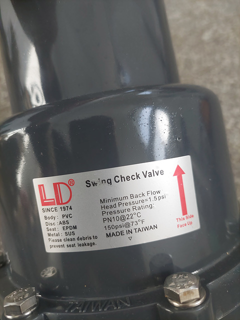 제가 사용한 밸브의 스티커를 한번 확인해보았습니다. 디스크판에 따라 유체의 흐름 방향이 있으니 이점 꼭 유의해 주셔야 하며 제품명에 명확하게 스윙 체크 밸브라고 쓰여있는 걸 볼 수가 있습니다.